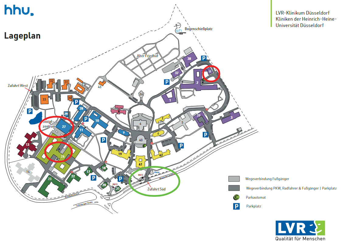 Rot eingekreist sind die Tagungsräume im Sozialzentrum Haus 27 sowie das Therapiezentrum DTFZ Haus 26 direkt neben (unterhalb) dem Sozialzentrum.